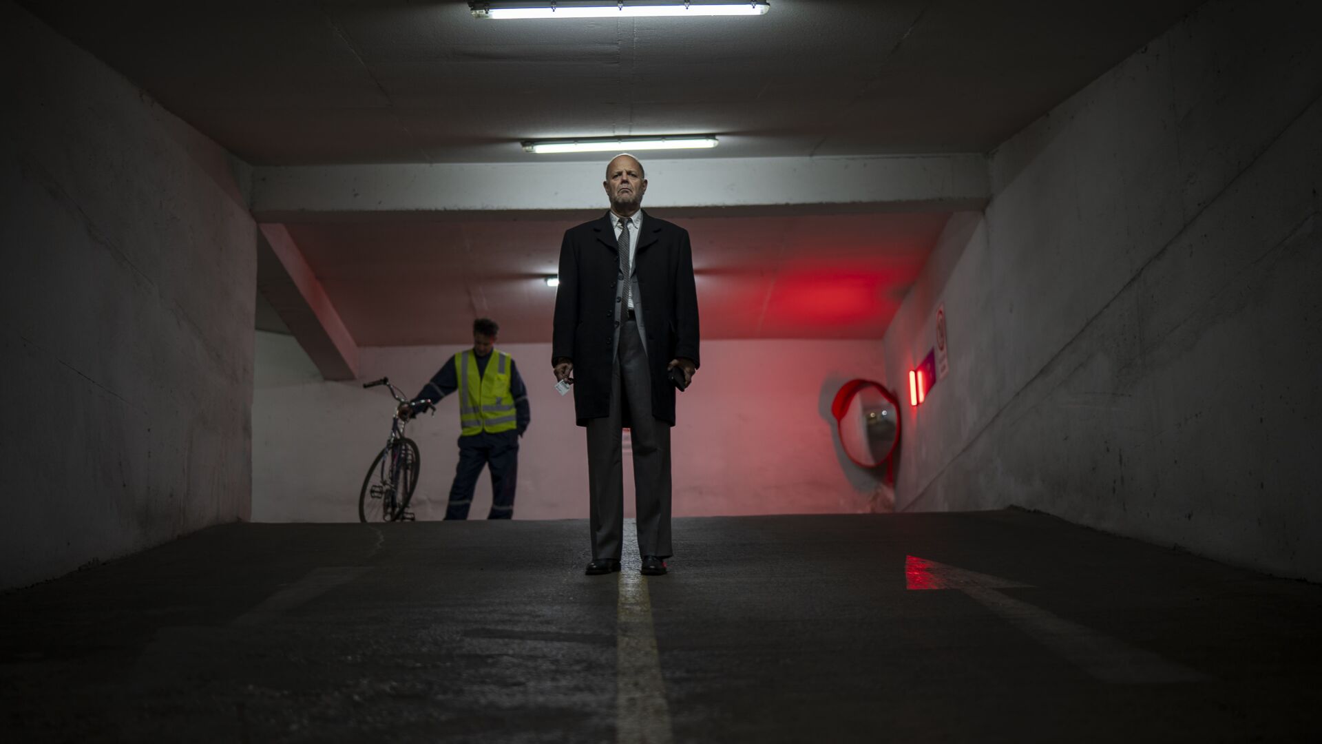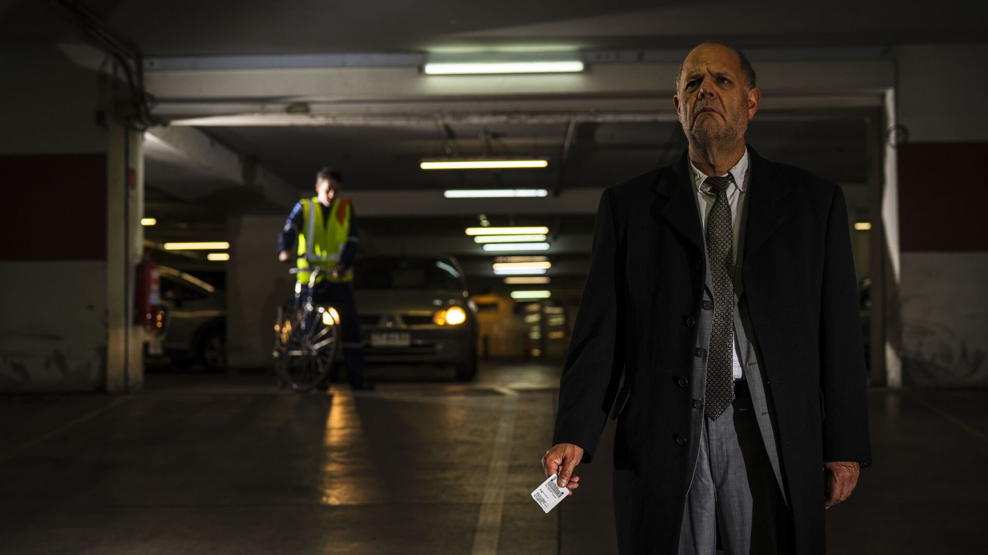 La obra pone en escena el encuentro de dos desconocidos en el estacionamiento de un centro comercial: Andante ha olvidado el lugar en el que estacionó su automóvil y lo busca infructuosamente, mientras Vigilante recorre los numerosos pisos del subterráneo en su bicicleta, siguiendo misteriosas instrucciones dictadas por el intercomunicador que lleva consigo. Nada es lo que parece y el absurdo se impone.