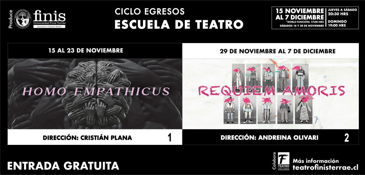 Como es tradición, la Escuela de Teatro de la Universidad Finis Terrae estrena su nueva camada de actores profesionales con un ciclo de dos obras dirigidos por destacados directores nacionales: Homo Empathicus una obra de ciencia ficción de la dramaturga alemana Rebekka Kricheldorf sobre una nueva especie humana habita la Tierra, dirigidos por Cristián Plana; y Requiem Amoris una obra de Juan Pablo Troncoso sobre la verdadera felicidad y la partenencia a un grupo, dirigidos por Andreina Olivarí.